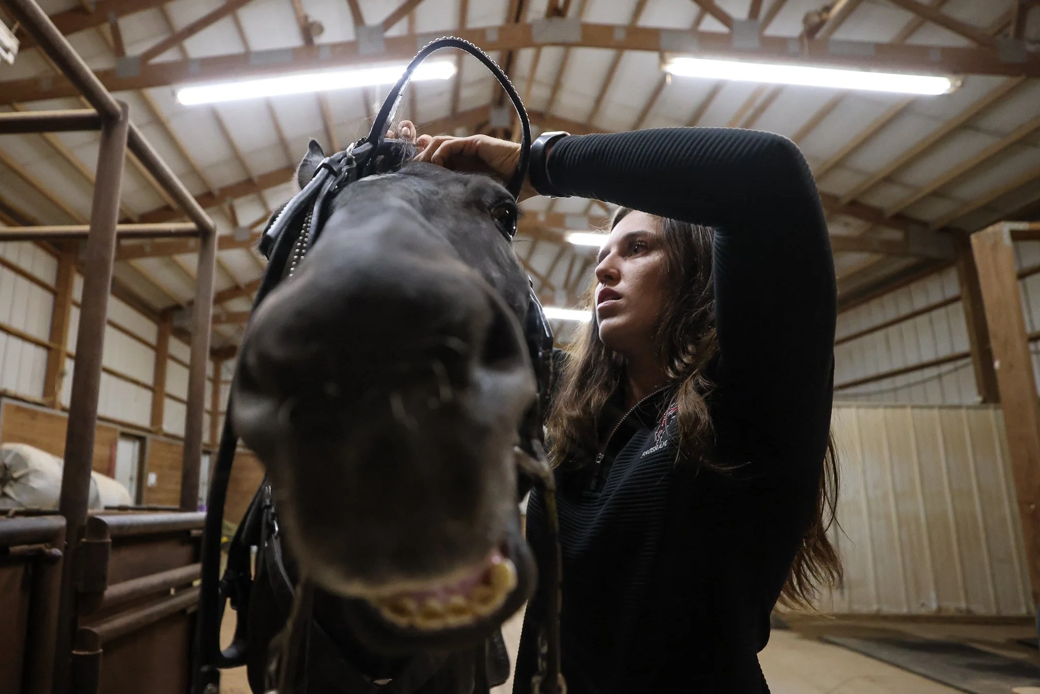 Centennial Champion smiles as Ellie Brown, the 63rd Masked Rider, dresses him in his riding gear at the Texas Tech Equestrian Center Aug. 30, 2024. Jacob Lujan/The Daily Toreador
